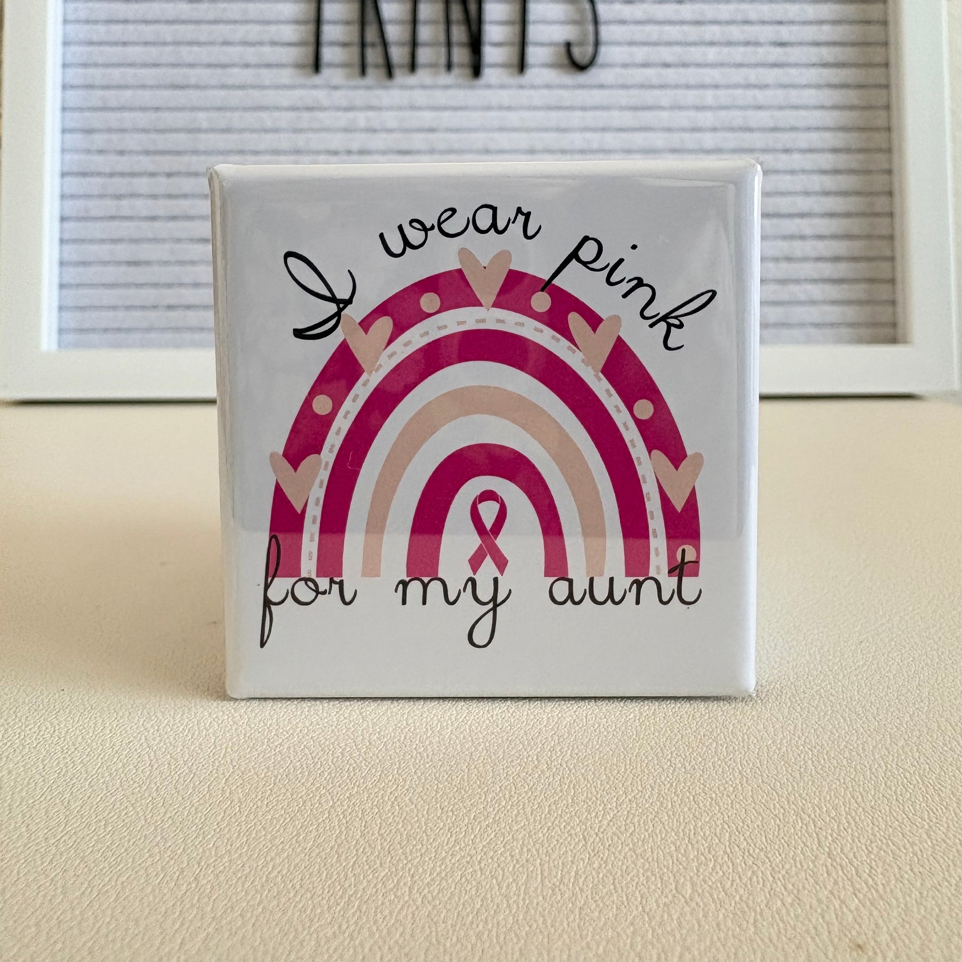 Show your unwavering support with our “I Wear Pink For My Aunt” pin or magnet. Each one is 2”x2” and handmade with love to raise awareness and honor the fighters, survivors, and those we remember. Perfect for gifts, your fridge, or showing support year-round.