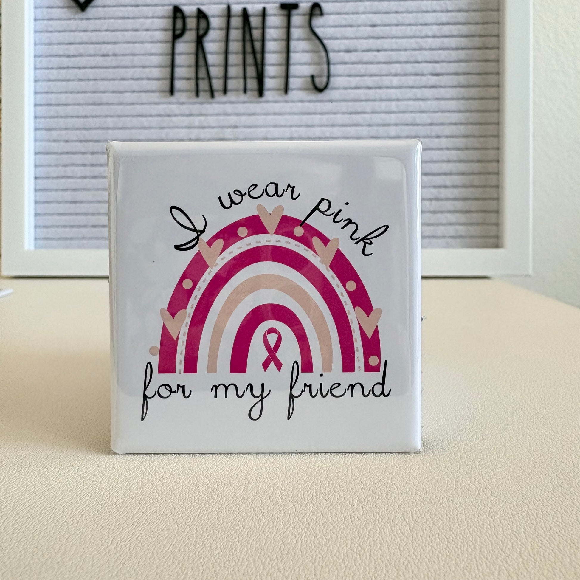 Show your unwavering support with our “I Wear Pink For My Friend” pin or magnet. Each one is 2”x2” and handmade with love to raise awareness and honor the fighters, survivors, and those we remember. Perfect for gifts, your fridge, or showing support year-round.