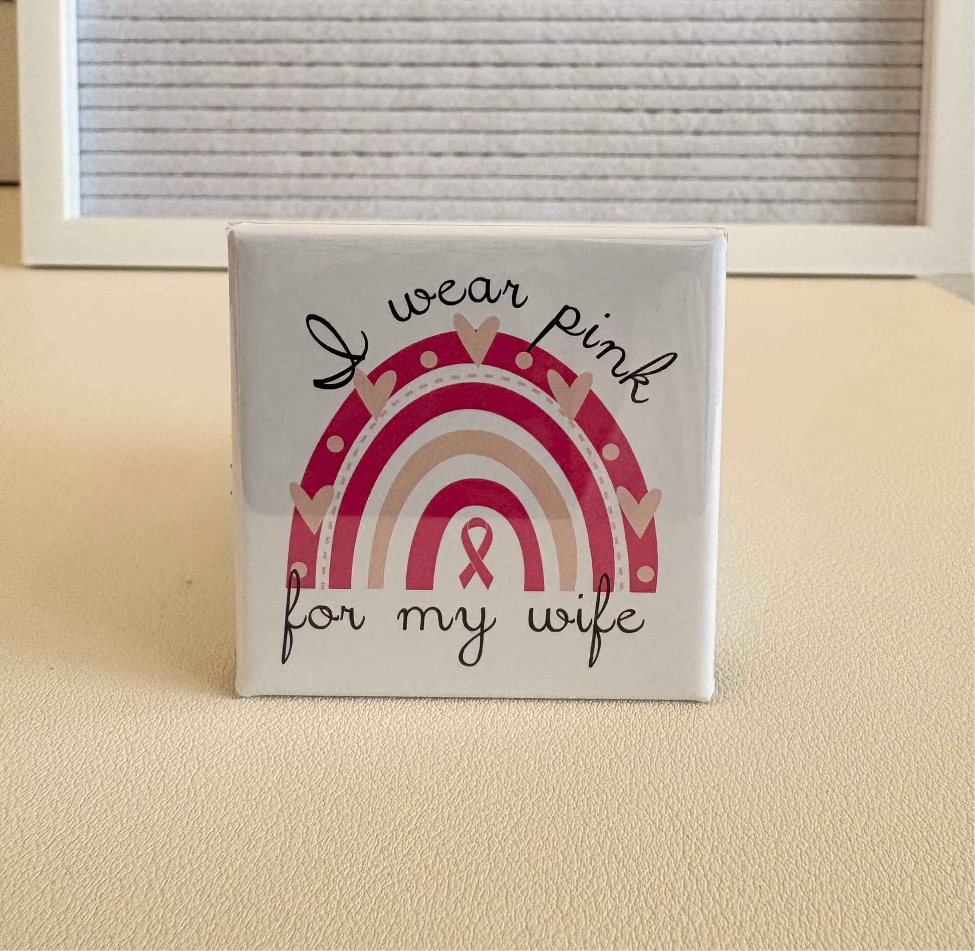 Show your unwavering support with our “I Wear Pink For My Wife” pin or magnet. Each one is 2”x2” and handmade with love to raise awareness and honor the fighters, survivors, and those we remember. Perfect for gifts, your fridge, or showing support year-round.